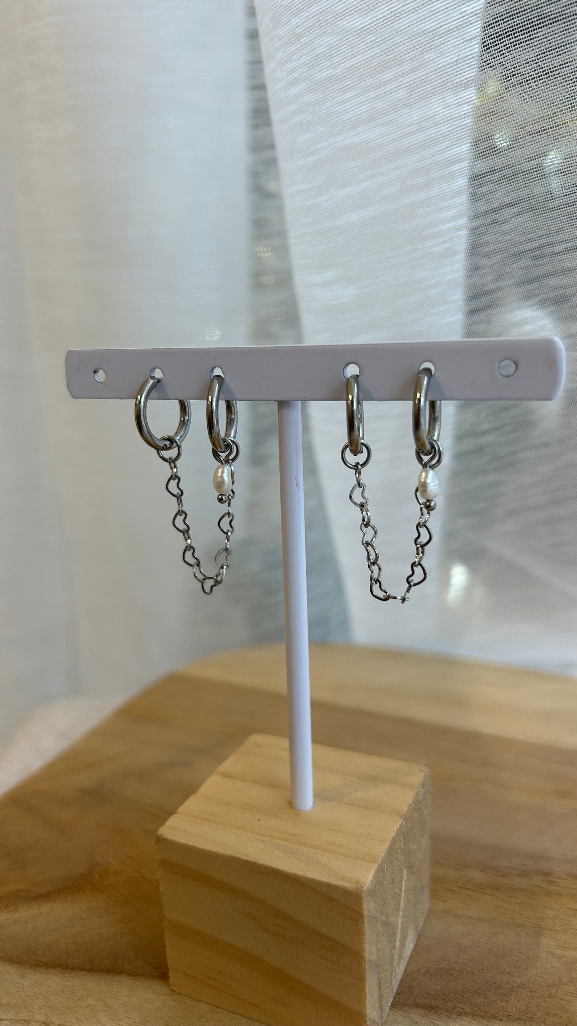 Les boucles d’oreilles LAURE sont composées de créoles accompagnées de perles d'eau douce et d'une chaînette cœur. Elles sont en acier inoxydable.
