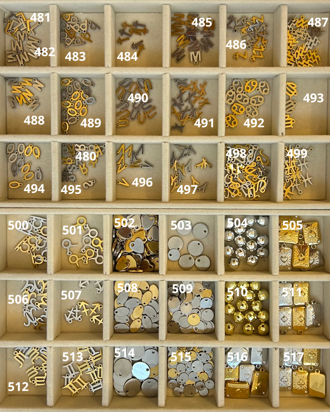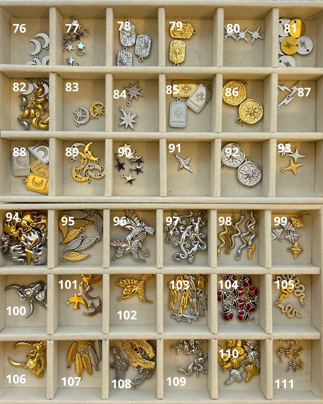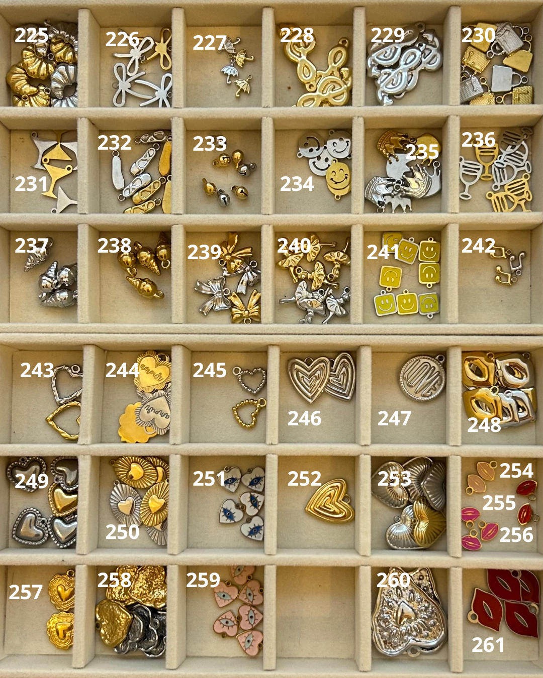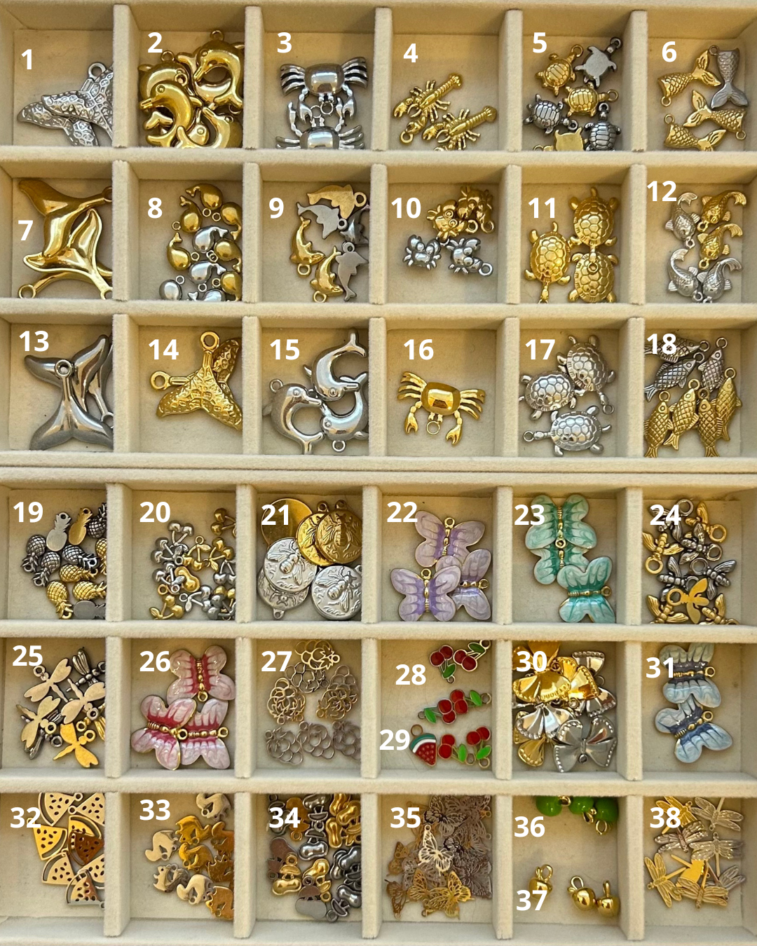 Les breloques sélectionnées seront disposées de haut en bas sur la chaîne. Veuillez indiquer si la breloque choisi est de coloris or ou argent.